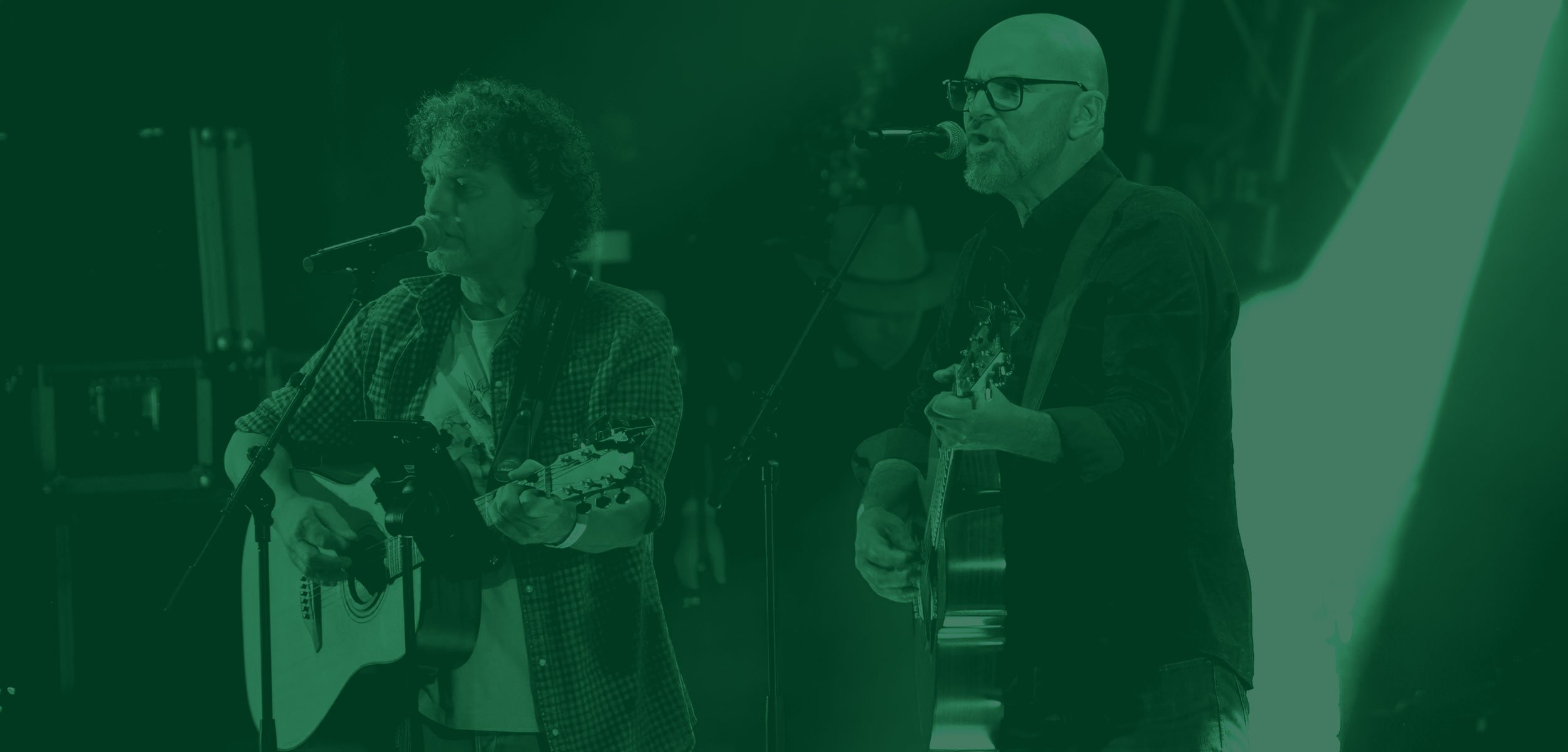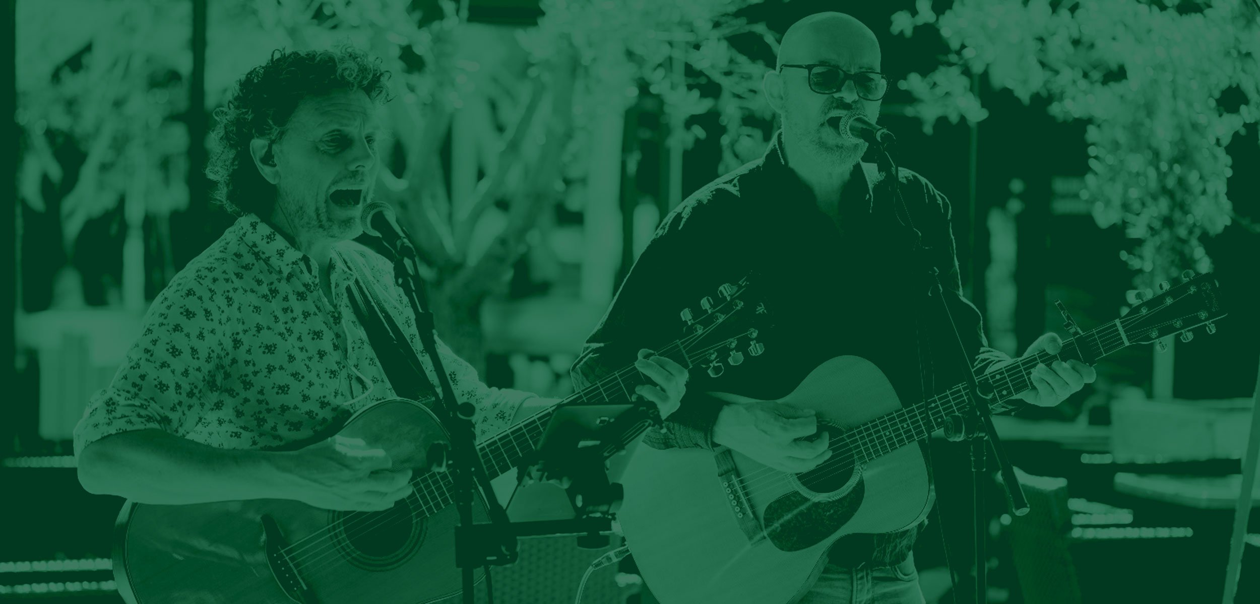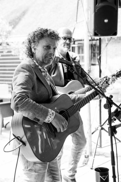 Twee stemmen, twee gitaren, af en toe een mondharmonica en een professionele installatie (met een volumeknop die twee kanten op kan…), meer heeft Ginfish niet nodig om op elke gelegenheid het plaatje compleet te maken. Compact maar toch met een verrassend vol geluid, wel aanwezig maar nooit hinderlijk.